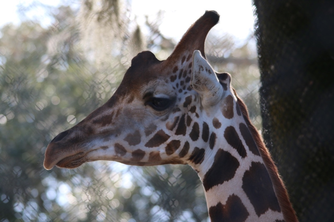 In the giraffe picture the odd diagonal striping in the background is because I was shooting through a chain link fence. The lens is able to focus through the fence so that it is not visually apparent in the foreground, but where there are point light-sources in the background from the gaps between the leaves the fence has an effect.